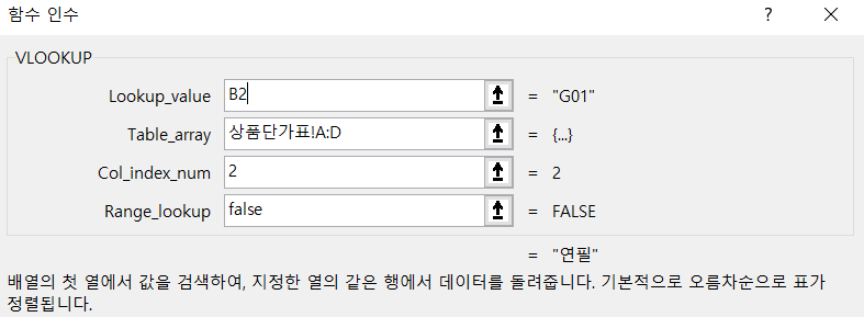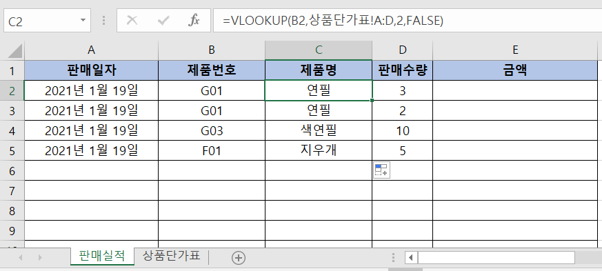 위처럼 수식을 입력하면, 아래처럼 제품명이 상품단가표 시트에 적힌대로 자동으로 입력됩니다.