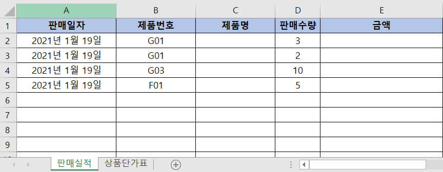 아래 그림처럼 '상품정보'가 입력될 시트를 만들고, 제품번호와 제품명 그리고 단가를 미리 입력해놓습니다.