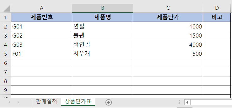 예를 들어, 회사에서 판매하는 상품목록과 가격정보를 입력해둔 시트가 있다고 가정합니다.