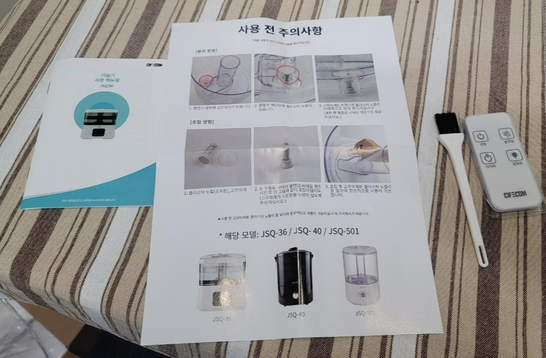 사용 설명서와 사용 전 주의사항, 청소솔, 리모컨이 함께 들어있었어요.