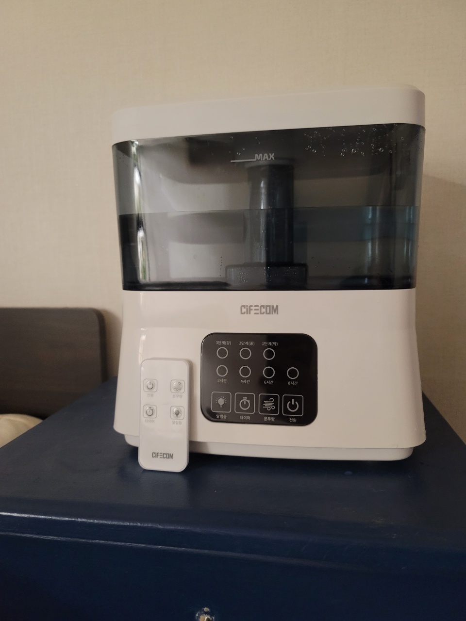 리모컨을 보면 전원, 분무량, 타이머, 알림등을 조절할 수 있는 버튼이 있었는데.