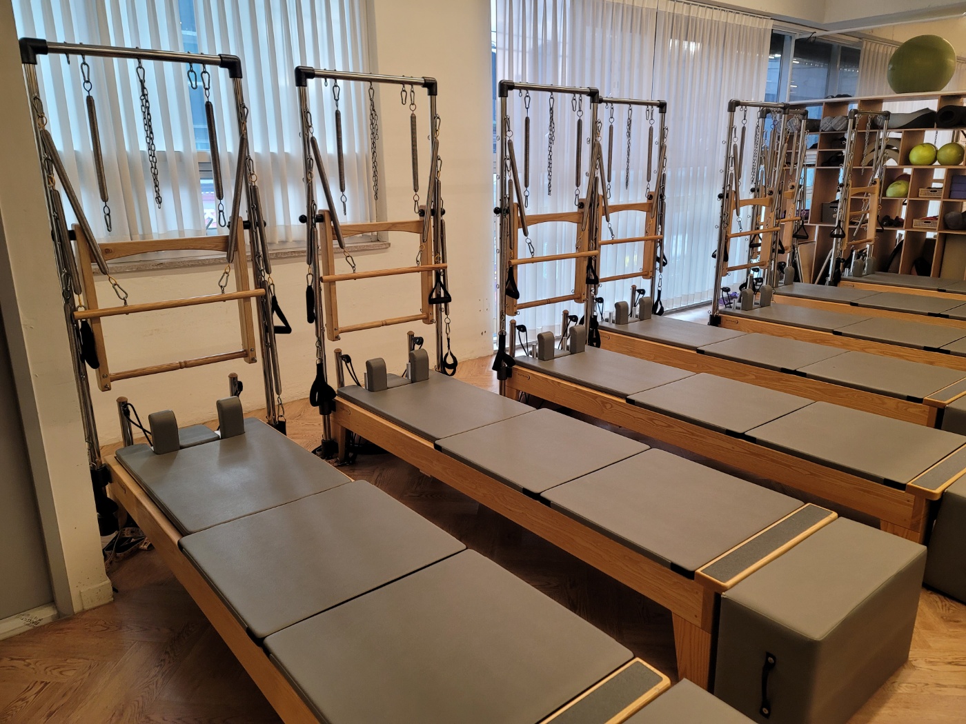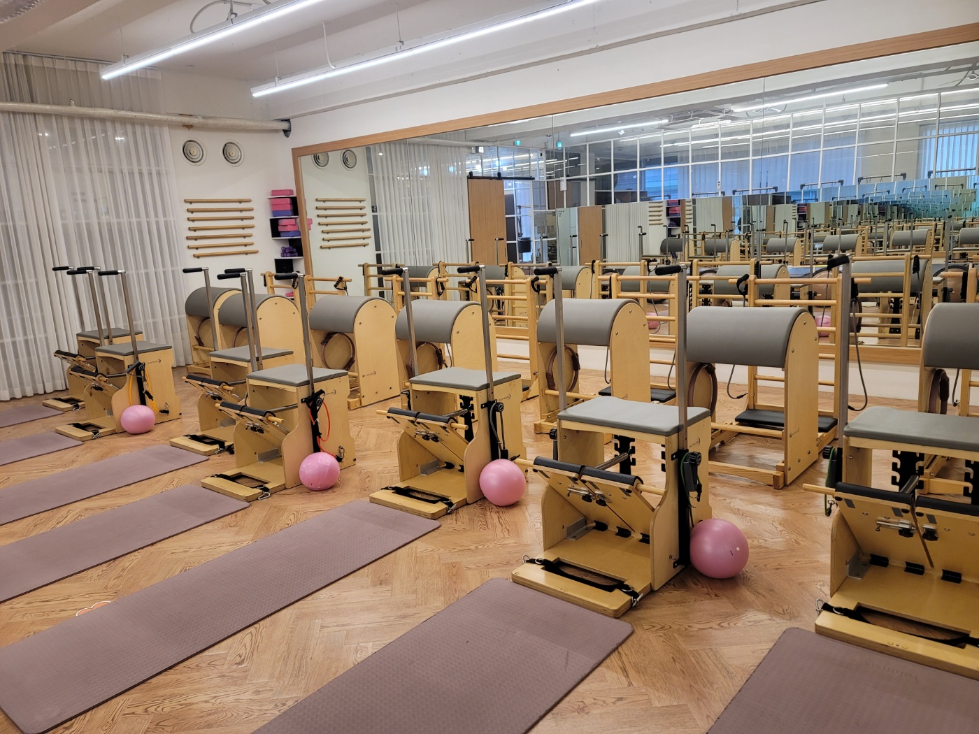바렐과 체어로 이루어진 공간과 캐딜락과 리포머로 이루어진 공간