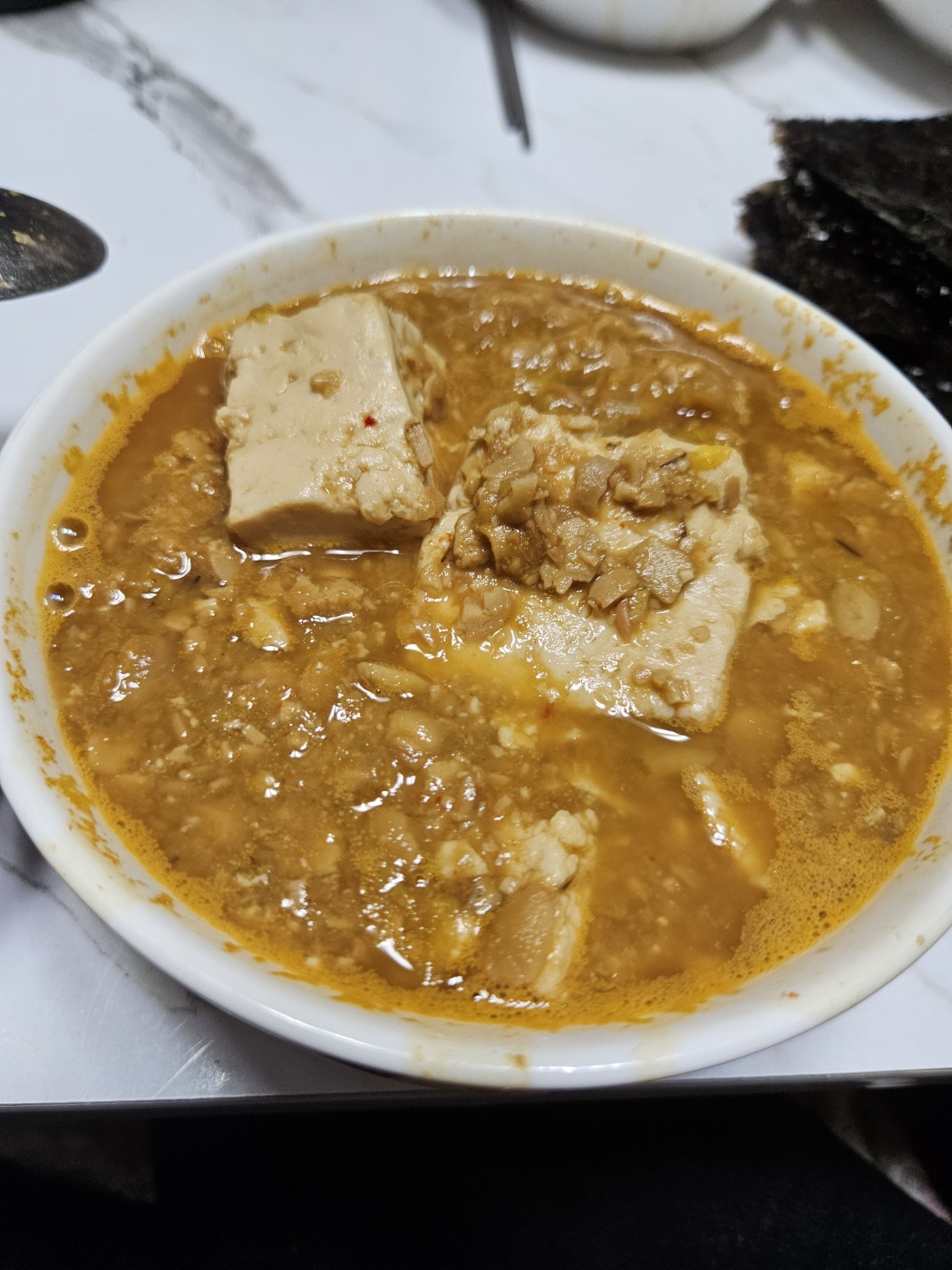 봄동 겉절이에 청국장을 끓여 먹었어요.