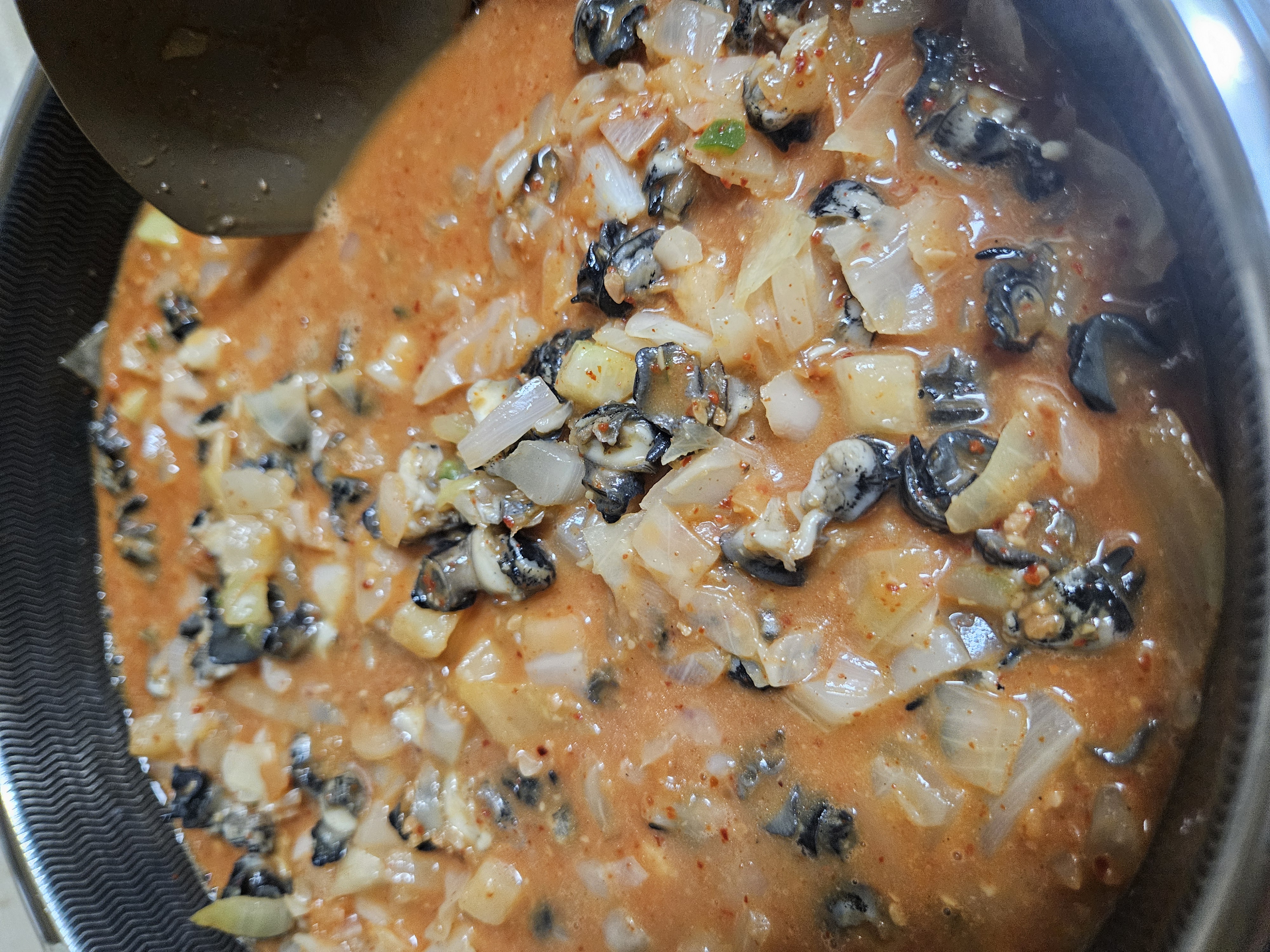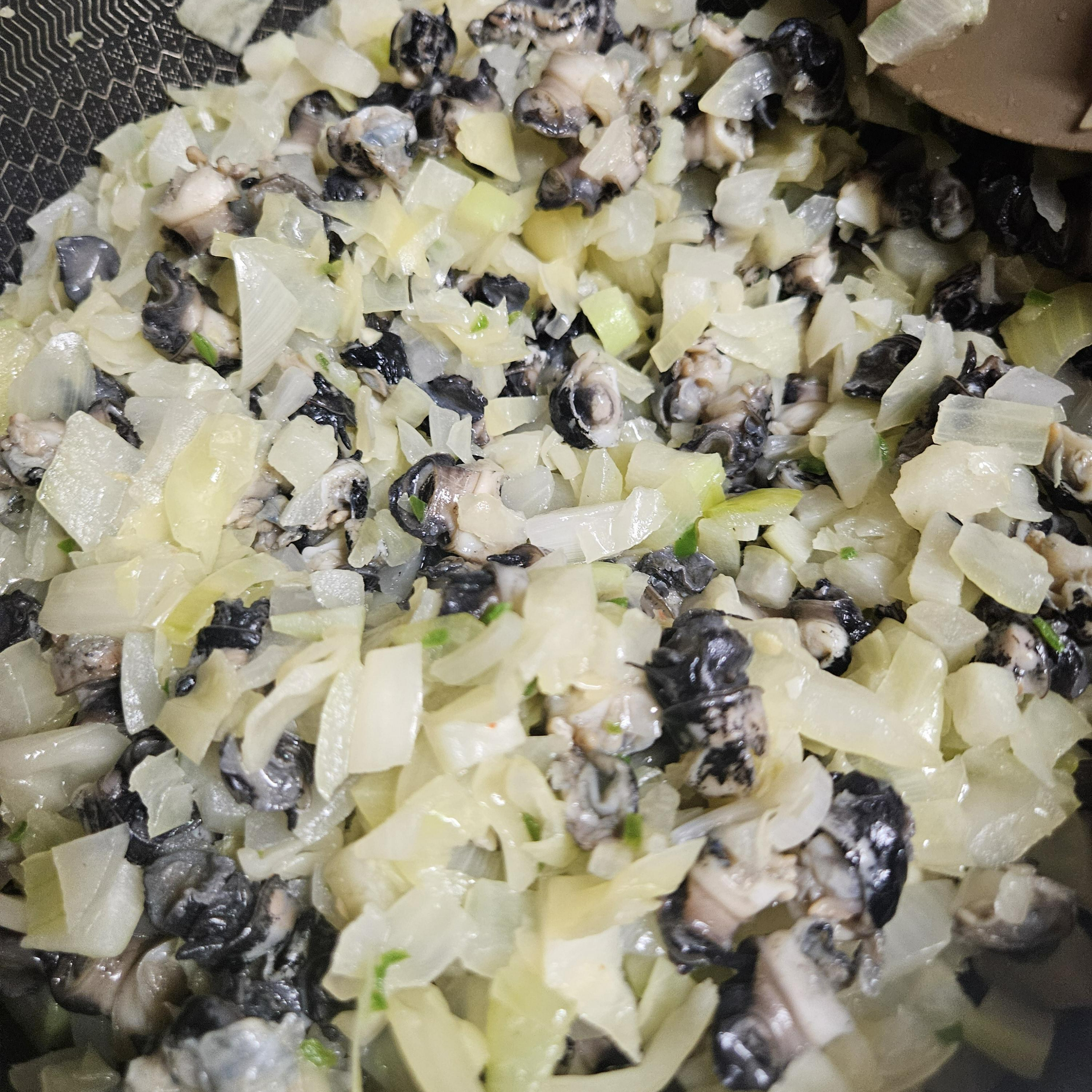 5. 채소들이 어느정도 익고 채수가 좀 나왔으면 1에서 준비한 우렁이를 넣고 한번 더 볶아 줍니다.