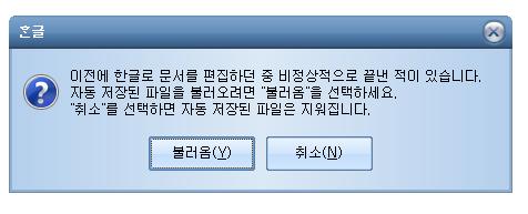 문서를 작성하다 갑자기 종료되었을 때, 다시 한글이 실행하면 위와같은 메시지가 뜹니다.